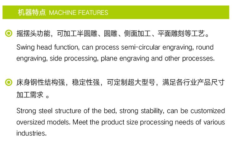 2、搖擺頭功能,可加工半圓雕、圓雕、側(cè)面加工、平面雕刻等工藝。